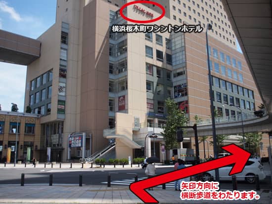 正面の「横浜桜木町ワシントンホテル」を確認したら、横断歩道を矢印方向に右折します。